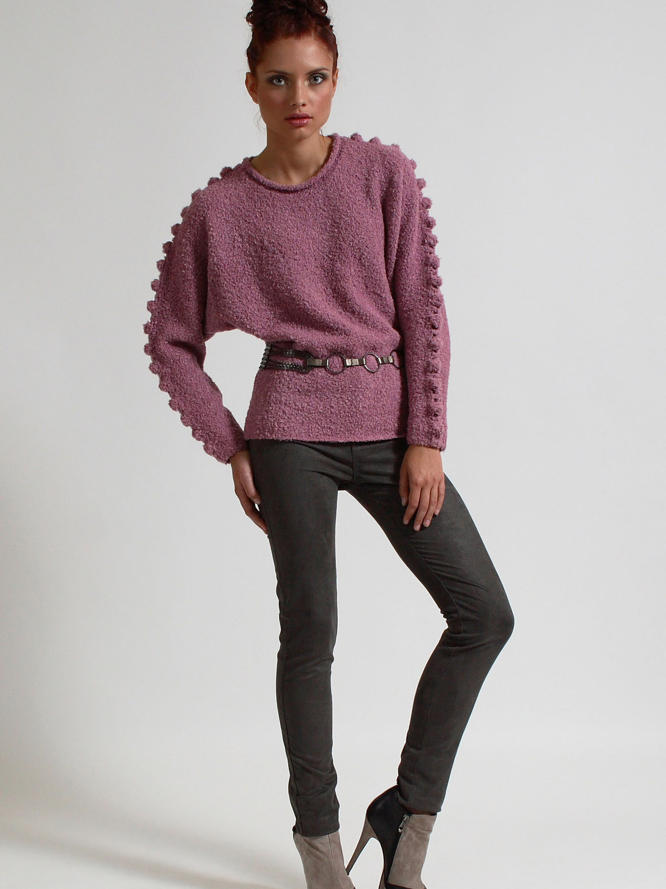 Дизайнерский джемпер жемчужно-розового цвета с рукавами "кимоно", связанный из великолепной по качеству буклированной пряжи с кид-мохером. Линия плеча украшена объемным узором из "шишек", связанным крючком, за счет мягкости полотна не создающим дискомфорта под верхней одеждой. Конструкция джемпера обеспечивает хорошую посадку на любую фигуру